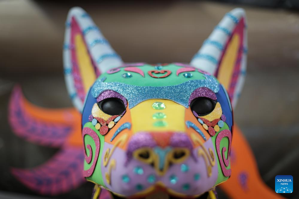 CIUDAD DE MEXICO, 24 octubre, 2024 (Xinhua) -- Imagen del 23 de octubre de 2024 de una máscara vista durante los preparativos para el Gran Desfile de Día de Muertos 2024, en el Taller El Volador, en la Ciudad de México, capital de México. (Xinhua/Francisco Cañedo)