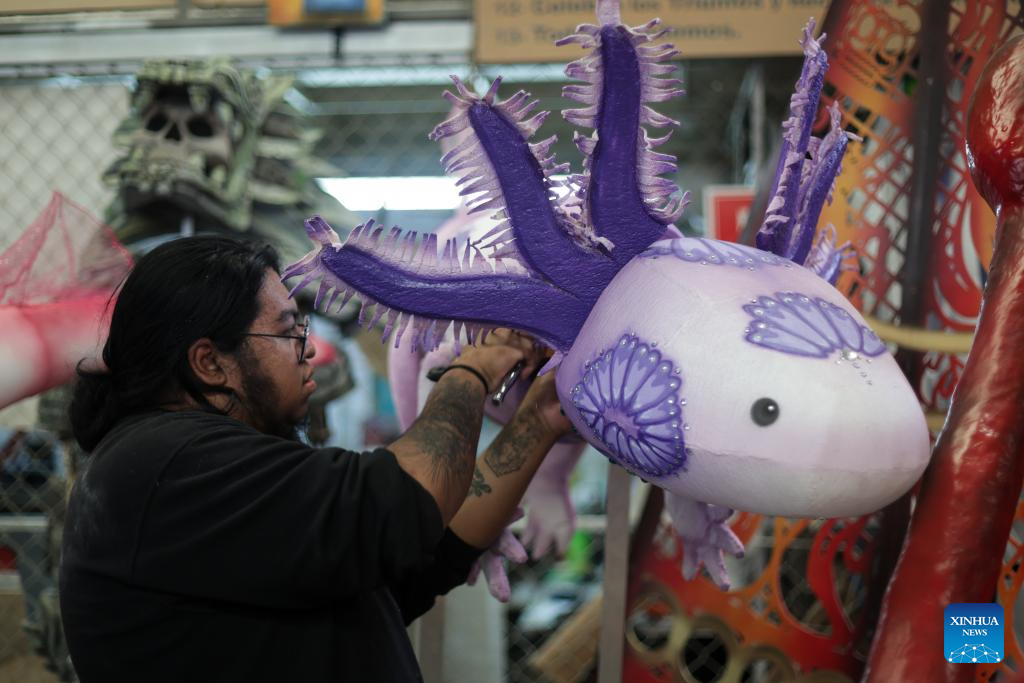 CIUDAD DE MEXICO, 24 octubre, 2024 (Xinhua) -- Imagen del 23 de octubre de 2024 de un hombre revisando la figura "Iztapaxolotl", un ajolote de 7 metros de largo que cuenta la historia del dios del inframundo Xólotl, durante los preparativos para el Gran Desfile de Día de Muertos 2024, en el Taller El Volador, en la Ciudad de México, capital de México. (Xinhua/Francisco Cañedo)