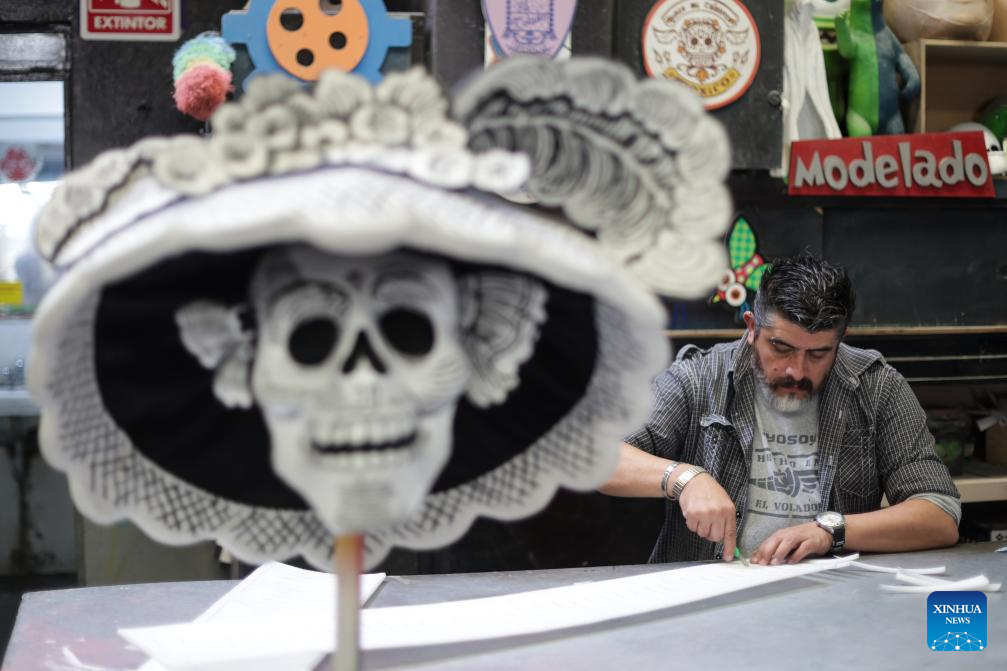 CIUDAD DE MEXICO, 24 octubre, 2024 (Xinhua) -- Imagen del 23 de octubre de 2024 de un hombre elaborando una pieza de un carro alegórico durante los preparativos para el Gran Desfile de Día de Muertos 2024, en el Taller El Volador, en la Ciudad de México, capital de México. (Xinhua/Francisco Cañedo)