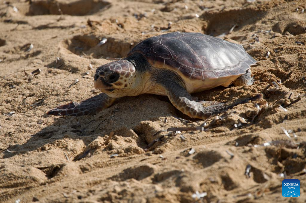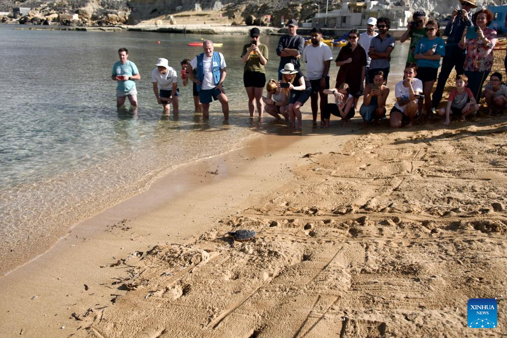 MGARR, 25 octubre, 2024 (Xinhua) -- Una tortuga es liberada al mar en la Bahía de Gnejna, en Mgarr, Malta, el 25 de octubre de 2024. Tres tortugas bobas fueron liberadas nuevamente al mar en la Bahía de Gnejna el viernes. (Xinhua/Jonathan Borg)