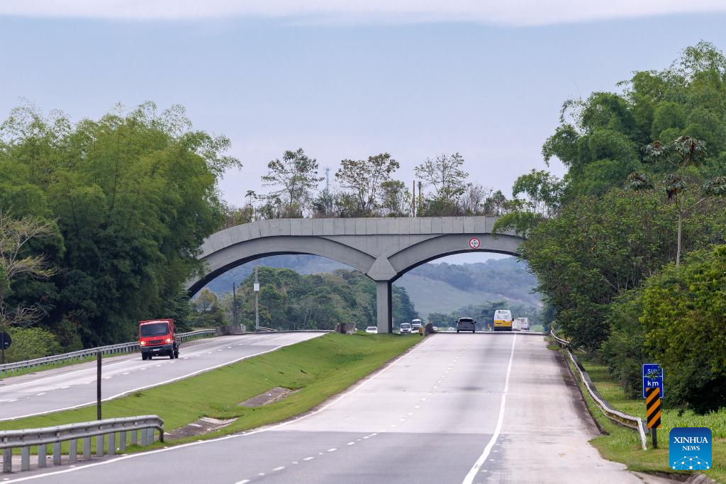 SILVA JARDIM, 25 octubre, 2024 (Xinhua) -- Imagen del 24 de octubre de 2024 de vehículos circulando debajo de un puente verde, un paso de fauna que ayuda a los animales silvestres a un cruce seguro, en la carretera BR-101, en Silva Jardim, en el estado de Río de Janeiro, Brasil. (Xinhua/Claudia Martini)