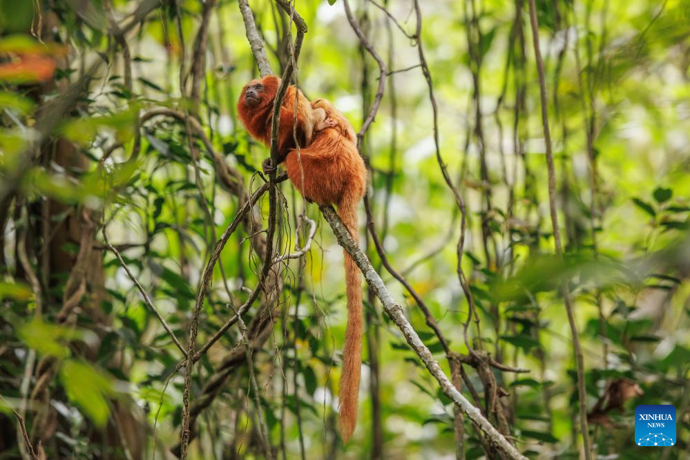 IMBAU, 25 octubre, 2024 (Xinhua) -- Imagen del 24 de octubre de 2024 de una hembra de tití león dorado (Leontopithecus rosalia) llevando a su cría en el dorso, en el Sendero de los Micos de la Granja Afectiva, en Imbaú, en el municipio de Silva Jardim, estado de Río de Janeiro, Brasil. (Xinhua/Claudia Martini)