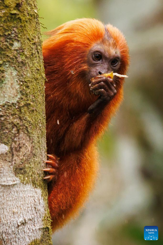 IMBAU, 25 octubre, 2024 (Xinhua) -- Imagen del 24 de octubre de 2024 de un tití león dorado (Leontopithecus rosalia) alimentándose, en el Sendero de los Micos de la Granja Afectiva, en Imbaú, en el municipio de Silva Jardim, estado de Río de Janeiro, Brasil. (Xinhua/Claudia Martini)