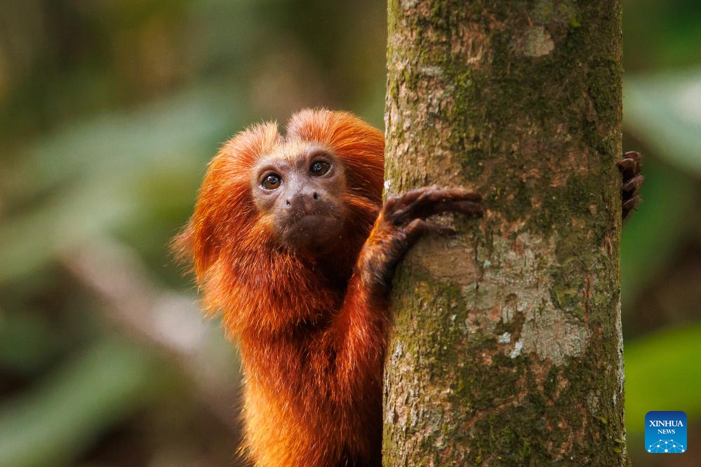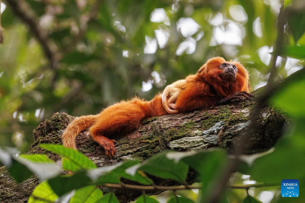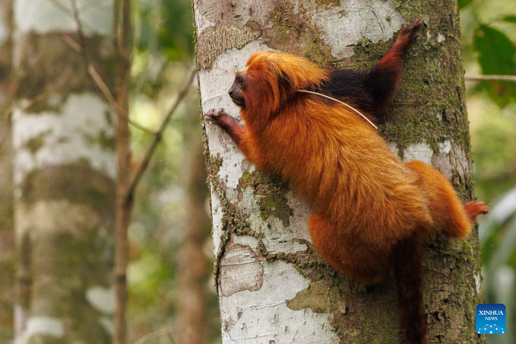 IMBAU, 25 octubre, 2024 (Xinhua) -- Imagen del 24 de octubre de 2024 de un tití león dorado (Leontopithecus rosalia) portando un collar de monitoreo con antena, en el Sendero de los Micos de la Granja Afectiva, en Imbaú, en el municipio de Silva Jardim, estado de Río de Janeiro, Brasil. (Xinhua/Claudia Martini)