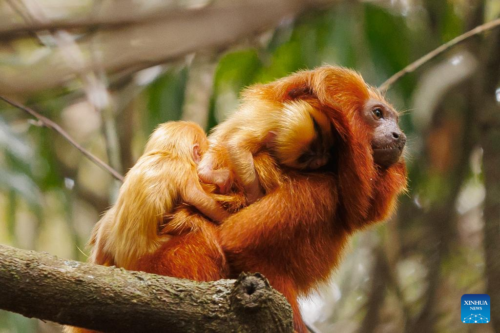 IMBAU, 25 octubre, 2024 (Xinhua) -- Imagen del 24 de octubre de 2024 de una hembra de tití león dorado (Leontopithecus rosalia) llevando a sus crías en el dorso, en el Sendero de los Micos de la Granja Afectiva, en Imbaú, en el municipio de Silva Jardim, estado de Río de Janeiro, Brasil. (Xinhua/Claudia Martini)