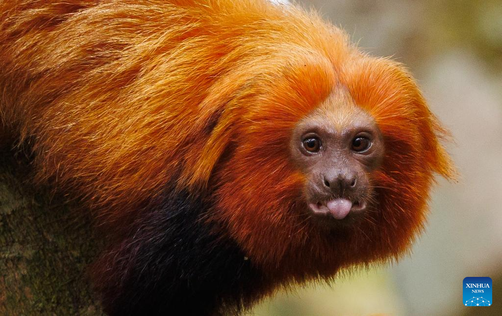 IMBAU, 25 octubre, 2024 (Xinhua) -- Imagen del 24 de octubre de 2024 de un tití león dorado (Leontopithecus rosalia) sacando la lengua, en el Sendero de los Micos de la Granja Afectiva, en Imbaú, en el municipio de Silva Jardim, estado de Río de Janeiro, Brasil. (Xinhua/Claudia Martini)
