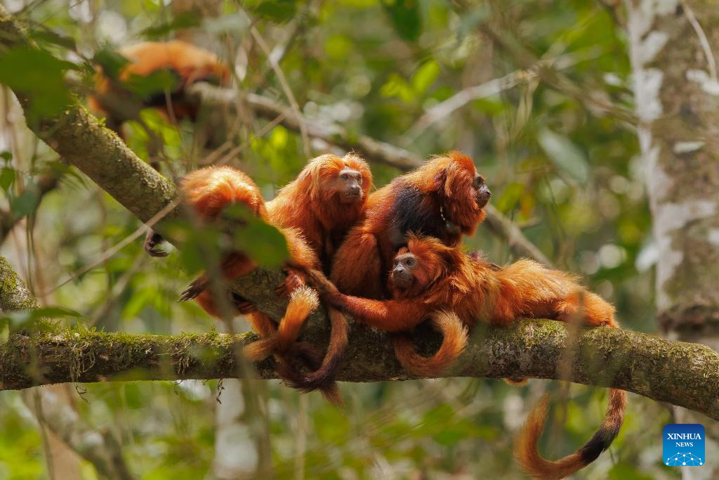 IMBAU, 25 octubre, 2024 (Xinhua) -- Imagen del 24 de octubre de 2024 un grupo de titíes león dorado (Leontopithecus rosalia) descansando sobre la rama de un árbol, en el Sendero de los Micos de la Granja Afectiva, en Imbaú, en el municipio de Silva Jardim, estado de Río de Janeiro, Brasil. (Xinhua/Claudia Martini)