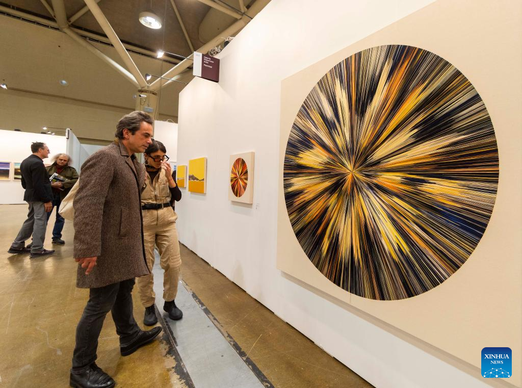 TORONTO, 26 octubre, 2024 (Xinhua) -- Imagen del 25 de octubre de 2024 de visitantes observando una obra de arte durante la Art Toronto 2024, en Toronto, Canadá. Abierta del 24 al 27 de octubre, la Art Toronto de este año alberga más de 100 galerías, instalaciones, espacios para proyectos, etc., nacionales e internacionales. (Xinhua/Zou Zheng)