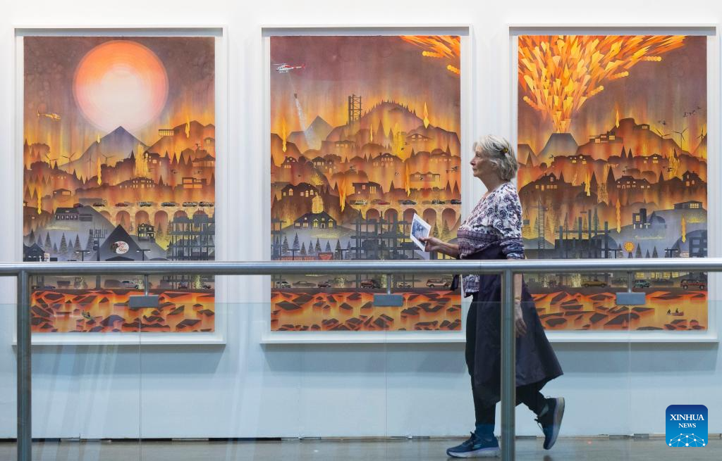 TORONTO, 26 octubre, 2024 (Xinhua) -- Imagen del 25 de octubre de 2024 de una visitante caminando junto a una obra de arte durante la Art Toronto 2024, en Toronto, Canadá. Abierta del 24 al 27 de octubre, la Art Toronto de este año alberga más de 100 galerías, instalaciones, espacios para proyectos, etc., nacionales e internacionales. (Xinhua/Zou Zheng)