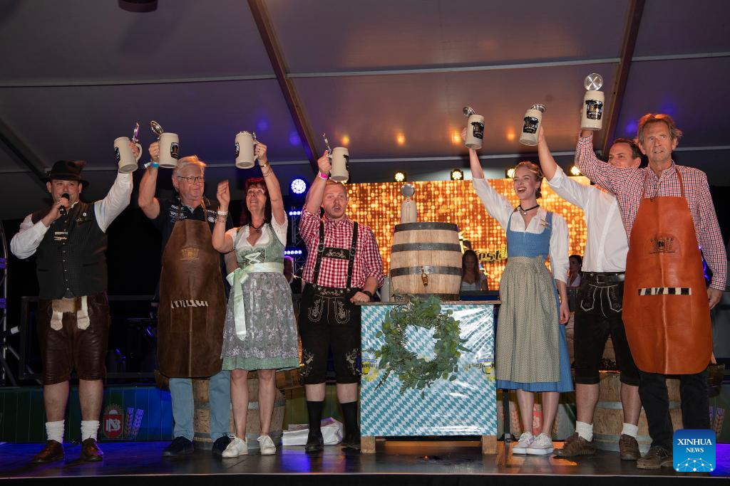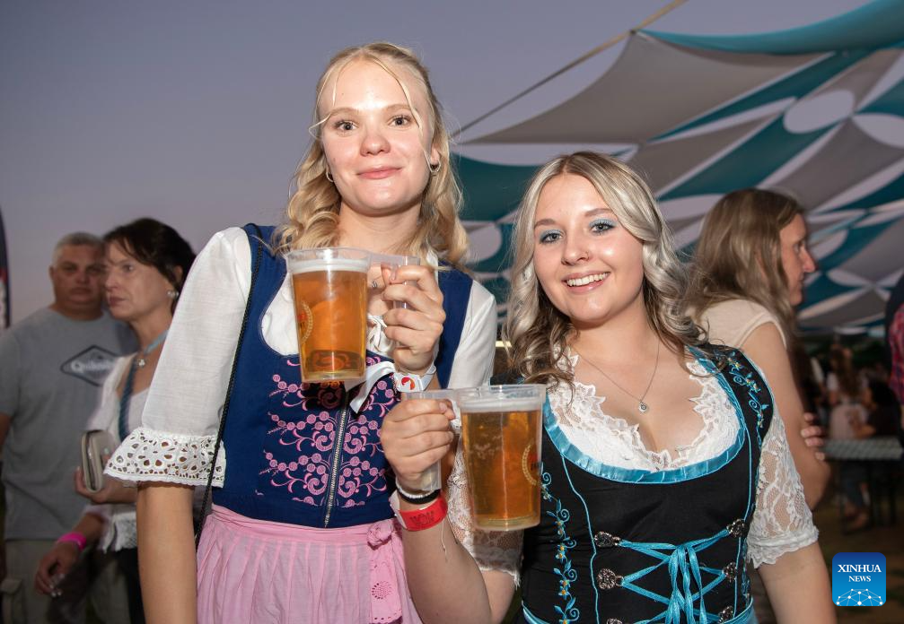 WINDHOEK, 26 octubre, 2024 (Xinhua) -- Imagen del 25 de octubre de 2024 de personas disfrutando cervezas en el Oktoberfest de Windhoek, en Windhoek, Namibia. La 64º edición del Oktoberfest de Windhoek comenzó el viernes en la capital namibia, Windhoek. (Xinhua/Chen Cheng)