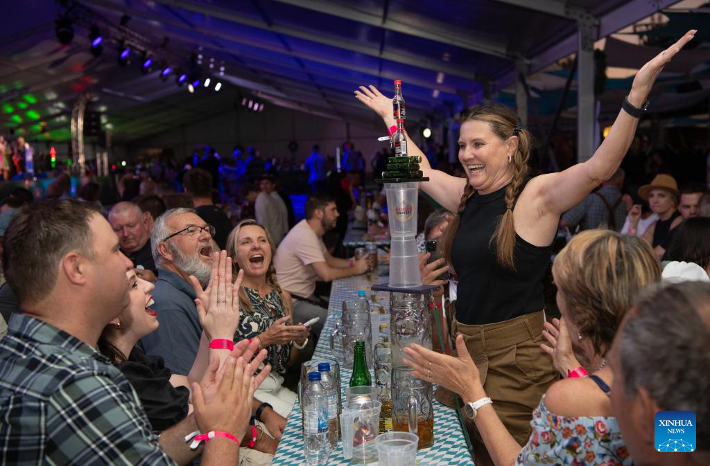 WINDHOEK, 26 octubre, 2024 (Xinhua) -- Imagen del 25 de octubre de 2024 de invitados festejando la inauguración del Oktoberfest de Windhoek, en Windhoek, Namibia. La 64º edición del Oktoberfest de Windhoek comenzó el viernes en la capital namibia, Windhoek. (Xinhua/Chen Cheng)