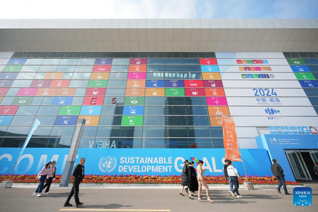 WEIHAI, 26 octubre, 2024 (Xinhua) -- Personas visitan una exposición de la Observancia de China del Día Mundial de las Ciudades 2024, en Weihai, en la provincia de Shandong, en el este de China, el 26 de octubre de 2024. Más de 2.000 delegados de más de 30 países y regiones asistieron al evento. (Xinhua/Tang Ke)