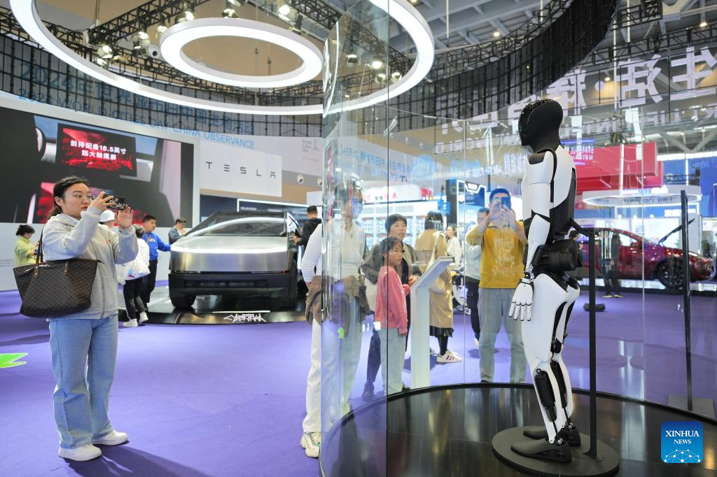 WEIHAI, 26 octubre, 2024 (Xinhua) -- Personas observan un robot de Tesla en una exposición de la Observancia de China del Día Mundial de las Ciudades 2024, en Weihai, en la provincia de Shandong, en el este de China, el 26 de octubre de 2024. Más de 2.000 delegados de más de 30 países y regiones asistieron al evento. (Xinhua/Tang Ke)