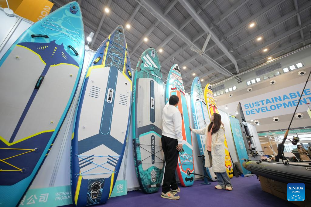 WEIHAI, 26 octubre, 2024 (Xinhua) -- Visitantes se informan sobre equipamiento para deportes al aire libre en una exposición de la Observancia de China del Día Mundial de las Ciudades 2024, en Weihai, en la provincia de Shandong, en el este de China, el 26 de octubre de 2024. Más de 2.000 delegados de más de 30 países y regiones asistieron al evento. (Xinhua/Tang Ke)