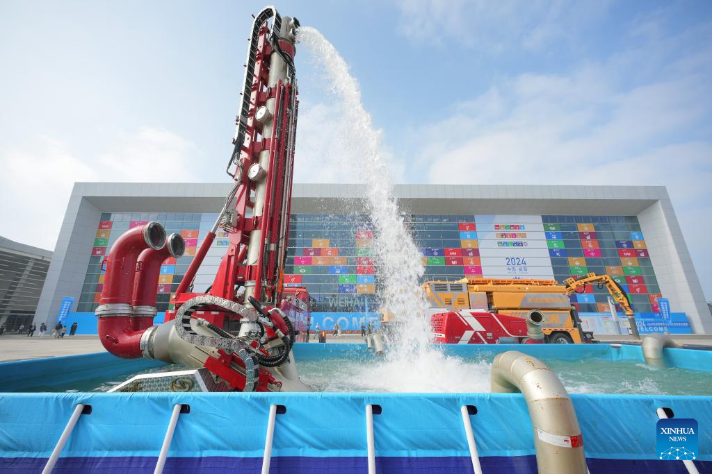 WEIHAI, 26 octubre, 2024 (Xinhua) -- Equipamiento de extinción de incendios es exhibido en una exposición de la Observancia de China del Día Mundial de las Ciudades 2024, en Weihai, en la provincia de Shandong, en el este de China, el 26 de octubre de 2024. Más de 2.000 delegados de más de 30 países y regiones asistieron al evento. (Xinhua/Tang Ke)