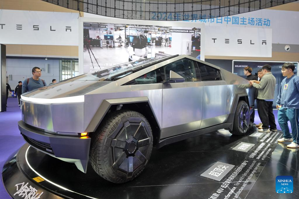 WEIHAI, 26 octubre, 2024 (Xinhua) -- Personas observan un Tesla Cybertruck en una exposición de la Observancia de China del Día Mundial de las Ciudades 2024, en Weihai, en la provincia de Shandong, en el este de China, el 26 de octubre de 2024. Más de 2.000 delegados de más de 30 países y regiones asistieron al evento. (Xinhua/Tang Ke)