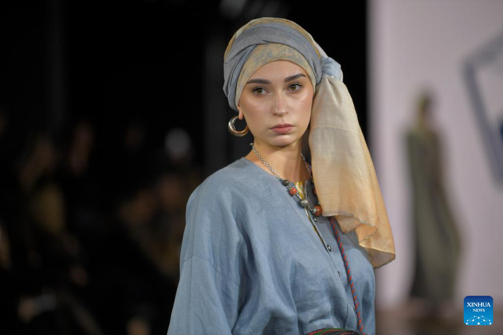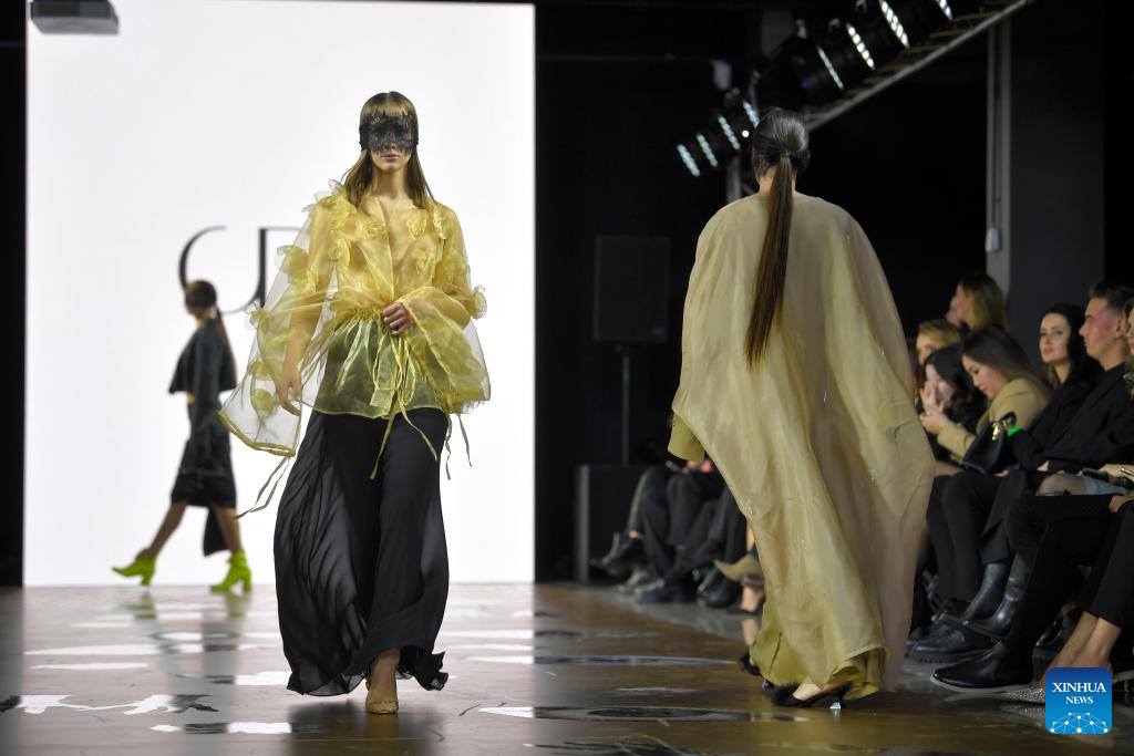 MOSCU, 27 octubre, 2024 (Xinhua) -- Imagen del 26 de octubre de 2024 de modelos presentando creaciones de un diseñador ruso durante la semana de la moda de Volga, en Moscú, Rusia. (Xinhua/Alexander Zemlianichenko Jr)