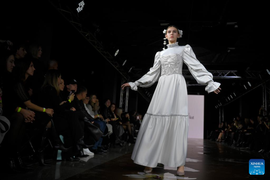 MOSCU, 27 octubre, 2024 (Xinhua) -- Imagen del 26 de octubre de 2024 de una modelo presentando una creación de un diseñador ruso durante la semana de la moda de Volga, en Moscú, Rusia. (Xinhua/Alexander Zemlianichenko Jr)