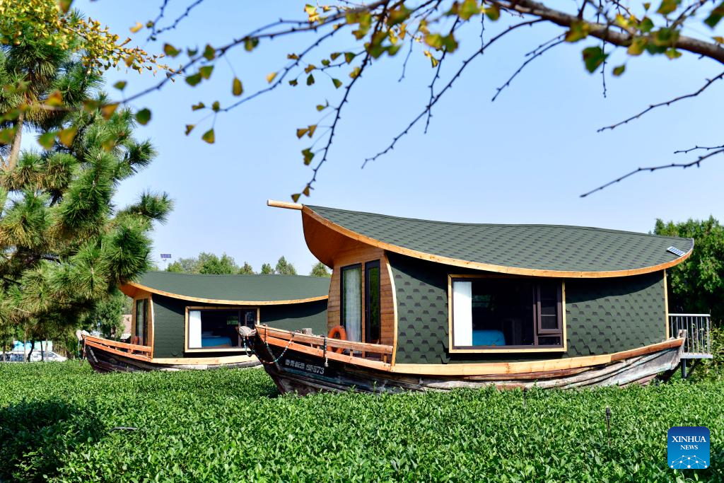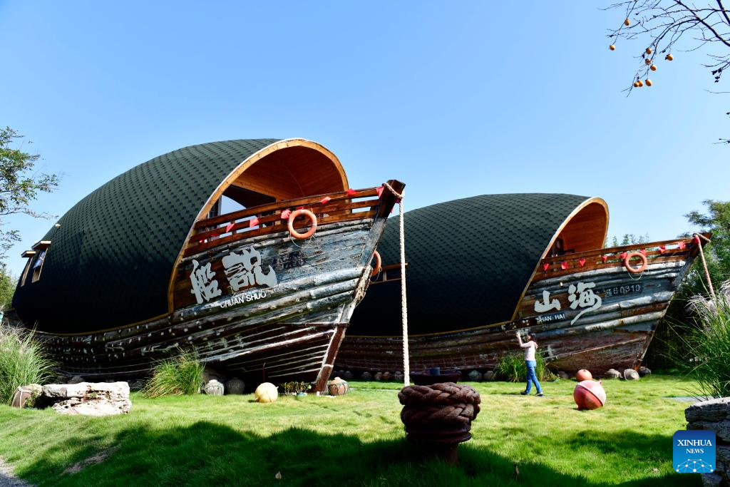 RIZHAO, 27 octubre, 2024 (Xinhua) -- Imagen del 25 de octubre de 2024 de residencias de alojamiento familiar convertidas de botes de pesca en el complejo turístico Shan Hai Tian, en Rizhao, en la provincia de Shandong, en el este de China. El complejo turístico Shan Hai Tian, cuyo nombre es traducido literal como "Montaña, Mar y Cielo", se ubica en la costa del mar Amarillo, en el este de China. Ha desarrollado un servicio de alojamiento en familias aprovechando las montañas, la costa y los jardines de té del lugar para mejorar tanto la experiencia turística como los ingresos comerciales. (Xinhua/Guo Xulei)