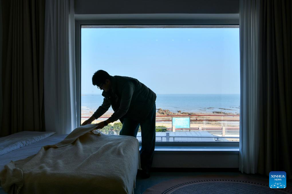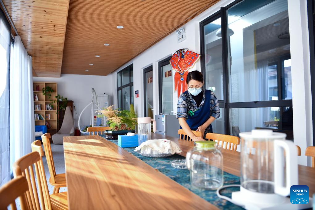 RIZHAO, 27 octubre, 2024 (Xinhua) -- Imagen del 25 de octubre de 2024 de una empleada trabajando en un alojamiento familiar en el complejo turístico Shan Hai Tian, en Rizhao, en la provincia de Shandong, en el este de China. El complejo turístico Shan Hai Tian, cuyo nombre es traducido literal como "Montaña, Mar y Cielo", se ubica en la costa del mar Amarillo, en el este de China. Ha desarrollado un servicio de alojamiento en familias aprovechando las montañas, la costa y los jardines de té del lugar para mejorar tanto la experiencia turística como los ingresos comerciales. (Xinhua/Liang Xu)