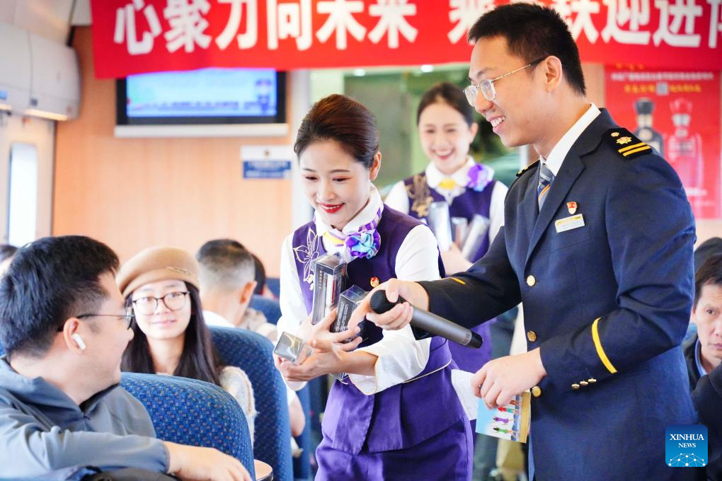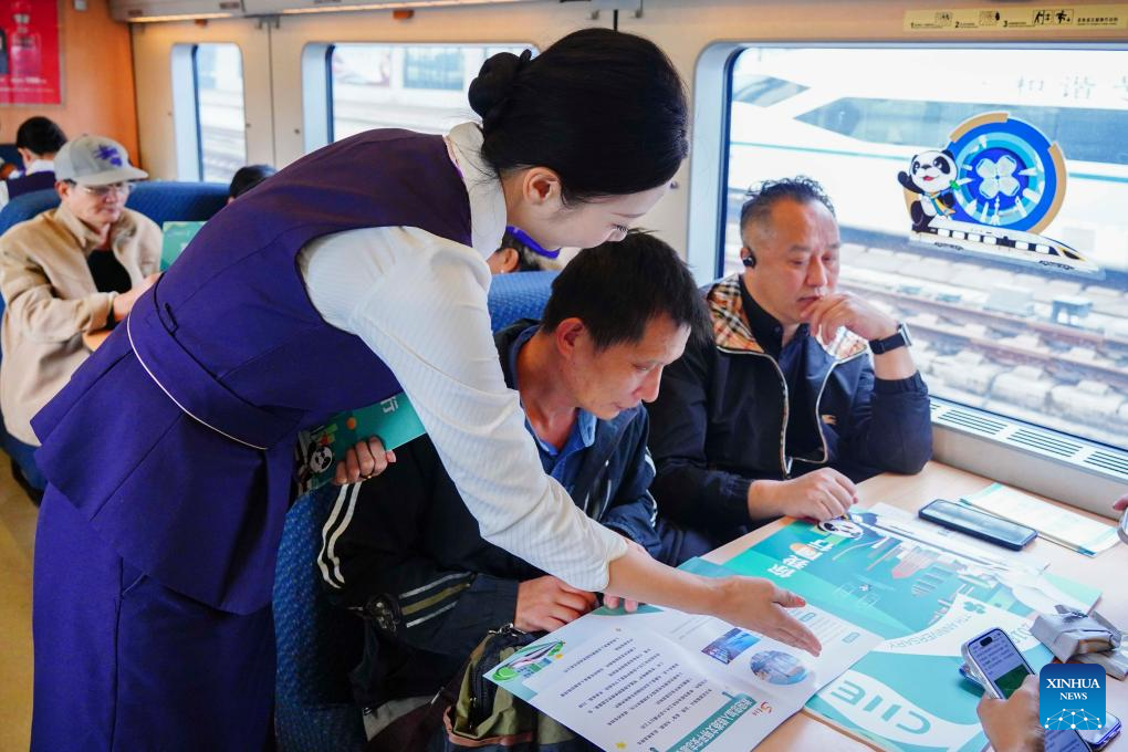 SHANGHAI, 28 octubre, 2024 (Xinhua) -- Una asistente de tren presenta a los pasajeros la VII Exposición Internacional de Importaciones de China (CIIE, por sus siglas en inglés) durante un evento de promoción de la CIIE en el tren D3205, el 28 de octubre de 2024. La CIIE se llevará a cabo en Shanghai del 5 al 10 de noviembre. (Xinhua/Xie Xin)