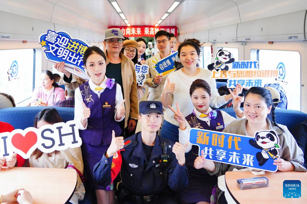 SHANGHAI, 28 octubre, 2024 (Xinhua) -- Pasajeros y miembros de la tripulación posan para una fotografía grupal durante un evento de promoción para la VII Exposición Internacional de Importaciones de China (CIIE, por sus siglas en inglés) en el tren D3205, el 28 de octubre de 2024. La CIIE se llevará a cabo en Shanghai del 5 al 10 de noviembre. (Xinhua/Xie Xin)