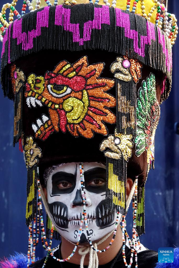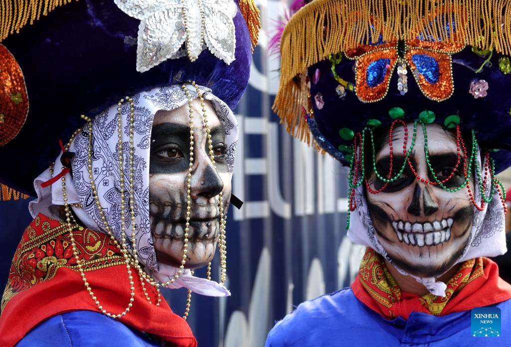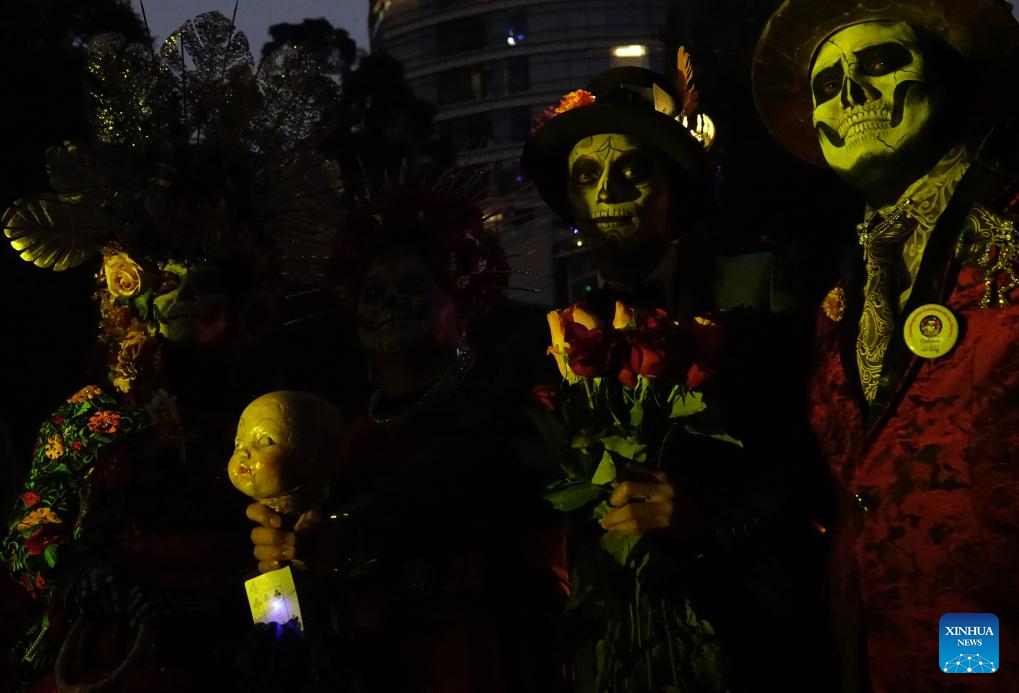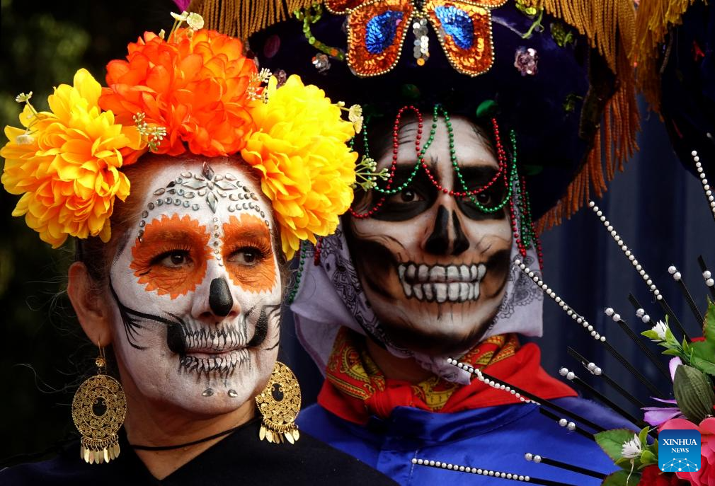 CIUDAD DE MEXICO, 28 octubre, 2024 (Xinhua) -- Imagen del 27 de octubre de 2024 de personas caracterizadas como catrines participando en la Mega Procesión de las Catrinas 2024, en la Ciudad de México, capital de México. (Xinhua/Carolina Endara)