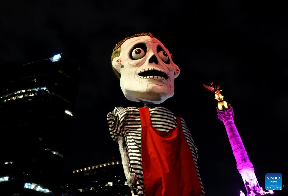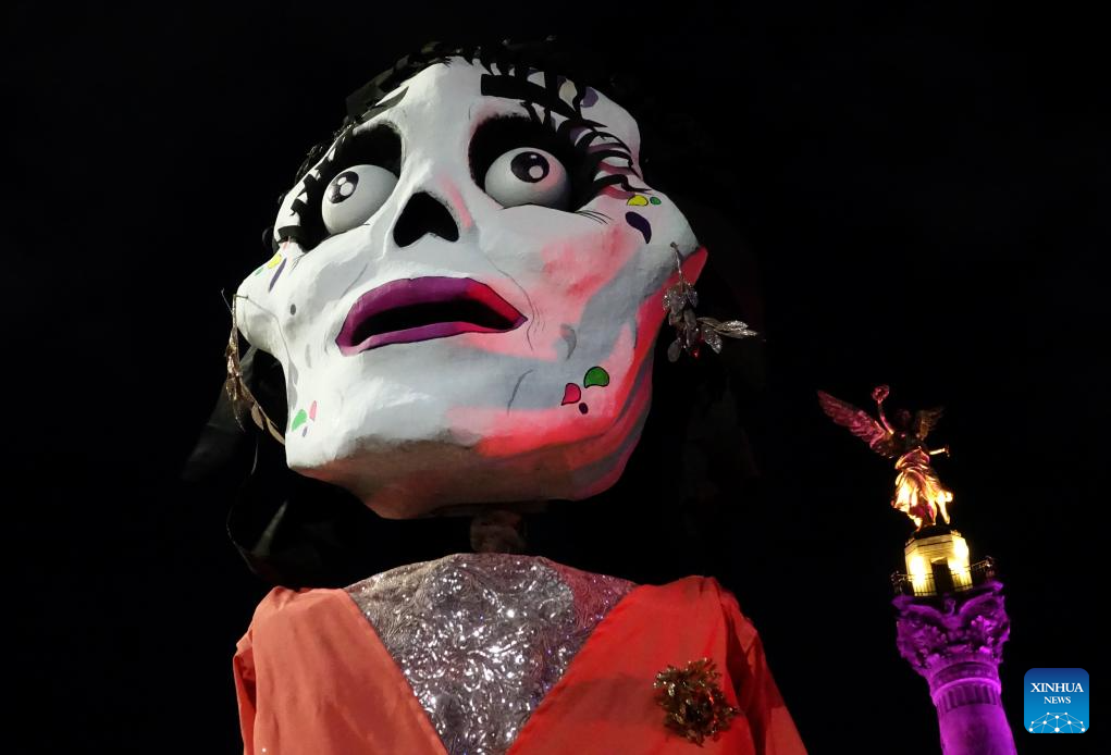CIUDAD DE MEXICO, 28 octubre, 2024 (Xinhua) -- Imagen del 27 de octubre de 2024 de la escultura de una catrina gigante vista en la Mega Procesión de las Catrinas 2024, en la Ciudad de México, capital de México. (Xinhua/Carolina Endara)
