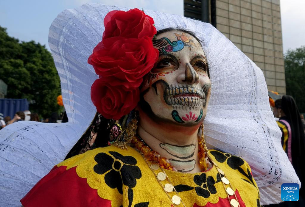 (241028) -- CIUDAD DE MEXICO, 28 octubre, 2024 (Xinhua) -- Imagen del 27 de octubre de 2024 de una mujer caracterizada como catrina participando en la Mega Procesión de las Catrinas 2024, en la Ciudad de México, capital de México. (Xinhua/Carolina Endara) (ce)