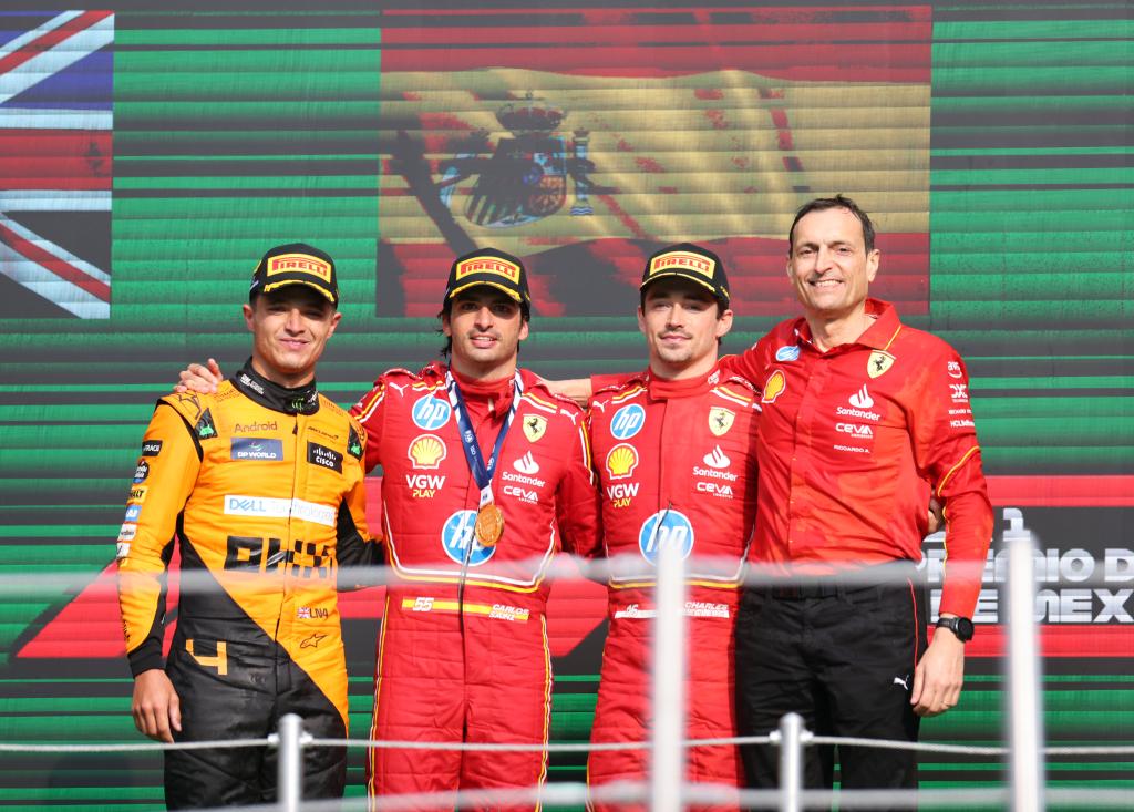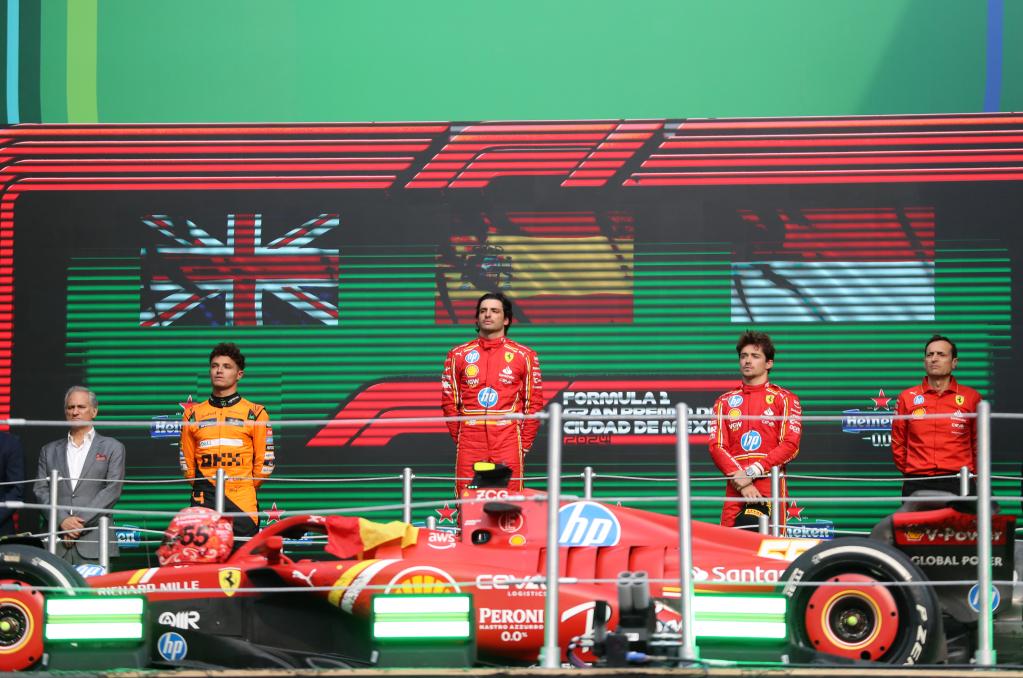 CIUDAD DE MEXICO, 28 octubre, 2024 (Xinhua) -- Imagen del 27 de octubre de 2024 del primer lugar, el piloto español de la escudería Ferrari, Carlos Sainz (2-i), del segundo lugar, el piloto británico de la escudería McLaren, Lando Norris (i), y del tercer lugar, el piloto monegasco de la escudería Ferrari, Charles Leclerc (2-d), y el ingeniero de carreras de la escudería Ferrari, Riccardo Adami, posando durante la ceremonia de premiación al término del Gran Premio de México de Fórmula Uno en el Autódromo Hermanos Rodríguez, en la Ciudad de México, capital de México. (Xinhua/Li Mengxin)