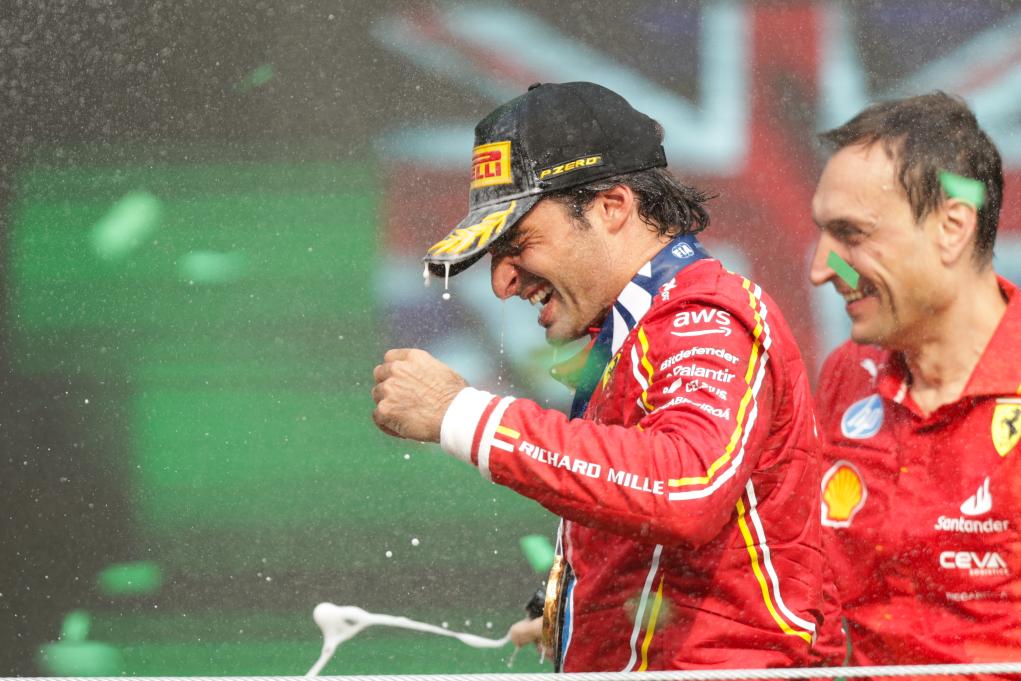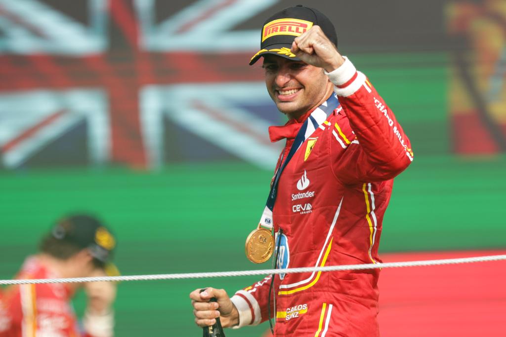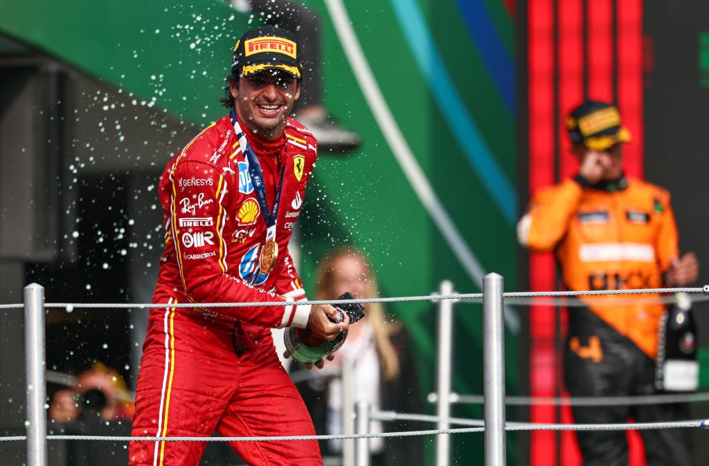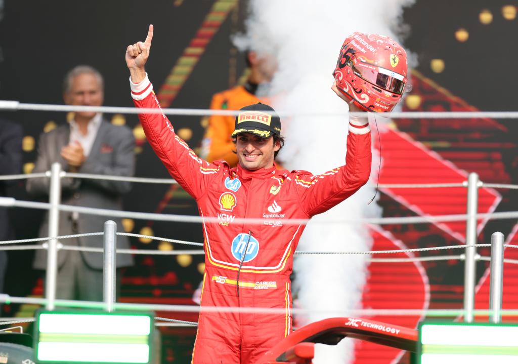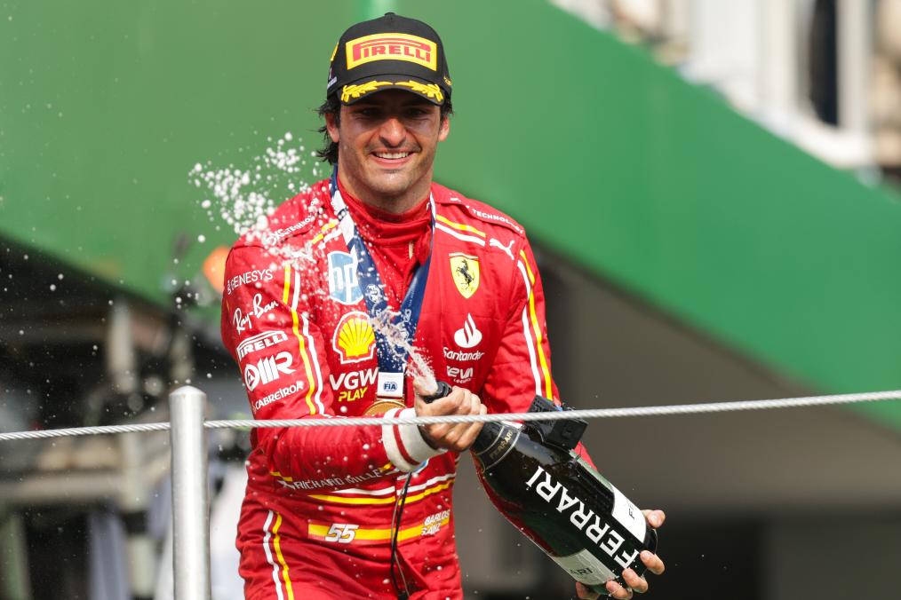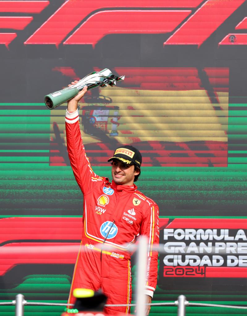 CIUDAD DE MEXICO, 28 octubre, 2024 (Xinhua) -- Imagen del 27 de octubre de 2024 del piloto español de la escudería Ferrari, Carlos Sainz, festejando durante la ceremonia de premiación al término del Gran Premio de México de Fórmula Uno en el Autódromo Hermanos Rodríguez, en la Ciudad de México, capital de México. (Xinhua/Song Haiyuan)