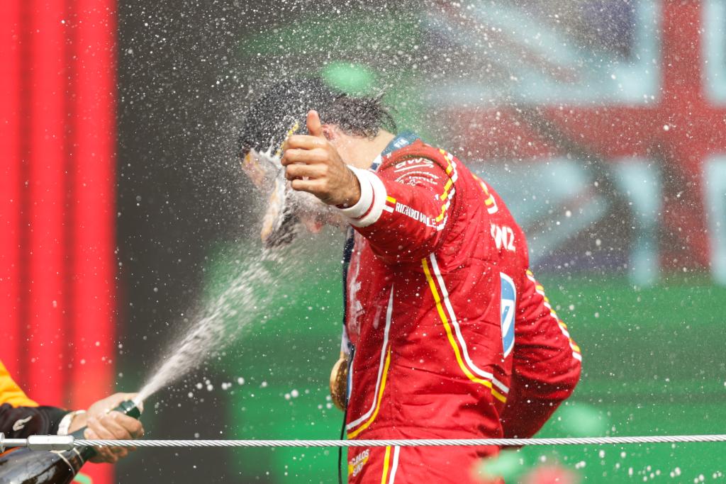 CIUDAD DE MEXICO, 28 octubre, 2024 (Xinhua) -- Imagen del 27 de octubre de 2024 del piloto español de la escudería Ferrari, Carlos Sainz, festejando durante la ceremonia de premiación al término del Gran Premio de México de Fórmula Uno en el Autódromo Hermanos Rodríguez, en la Ciudad de México, capital de México. (Xinhua/Li Mengxin)