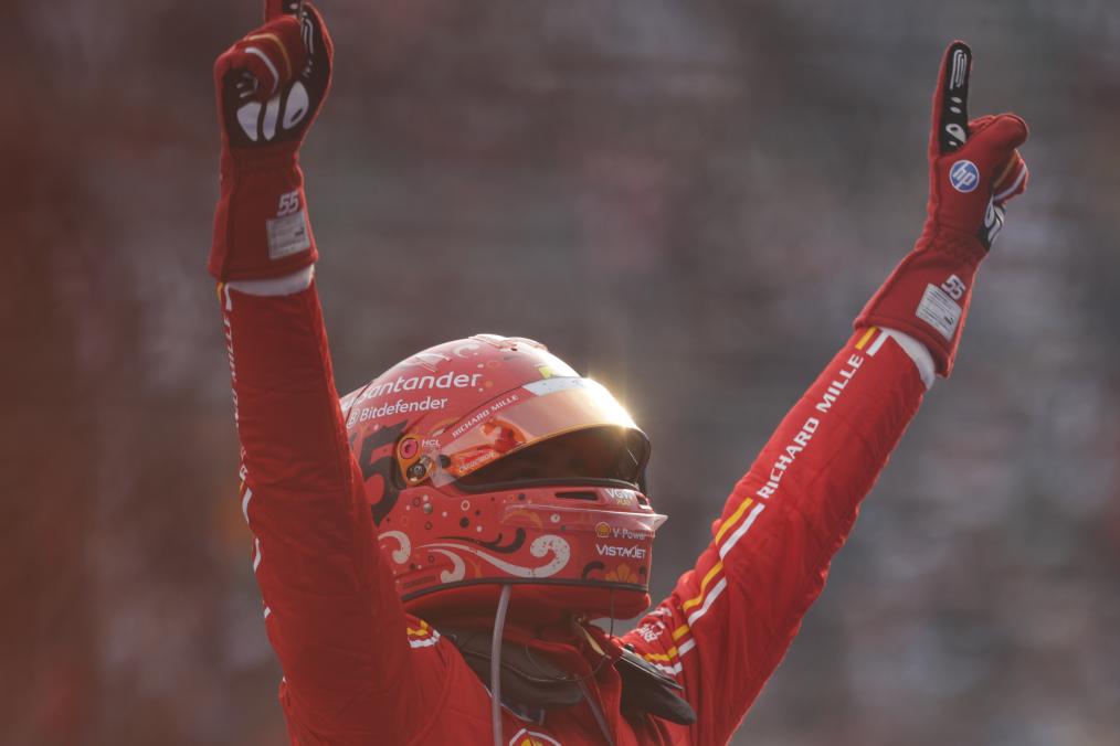 CIUDAD DE MEXICO, 28 octubre, 2024 (Xinhua) -- Imagen del 27 de octubre de 2024 del piloto español de la escudería Ferrari, Carlos Sainz, festejando al término de la carrera del Gran Premio de México de Fórmula Uno en el Autódromo Hermanos Rodríguez, en la Ciudad de México, capital de México. (Xinhua/Francisco Cañedo)