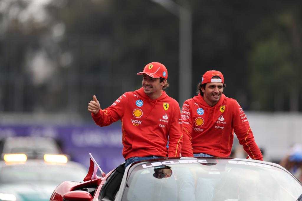 CIUDAD DE MEXICO, 28 octubre, 2024 (Xinhua) -- Imagen del 27 de octubre de 2024 del piloto español de la escudería Ferrari, Carlos Sainz (d), y su compañero de equipo, el piloto monegasco, Charles Leclerc, raccionan durante el desfile en la pista previo al Gran Premio de México de Fórmula Uno en el Autódromo Hermanos Rodríguez, en la Ciudad de México, capital de México. (Xinhua/Francisco Cañedo)