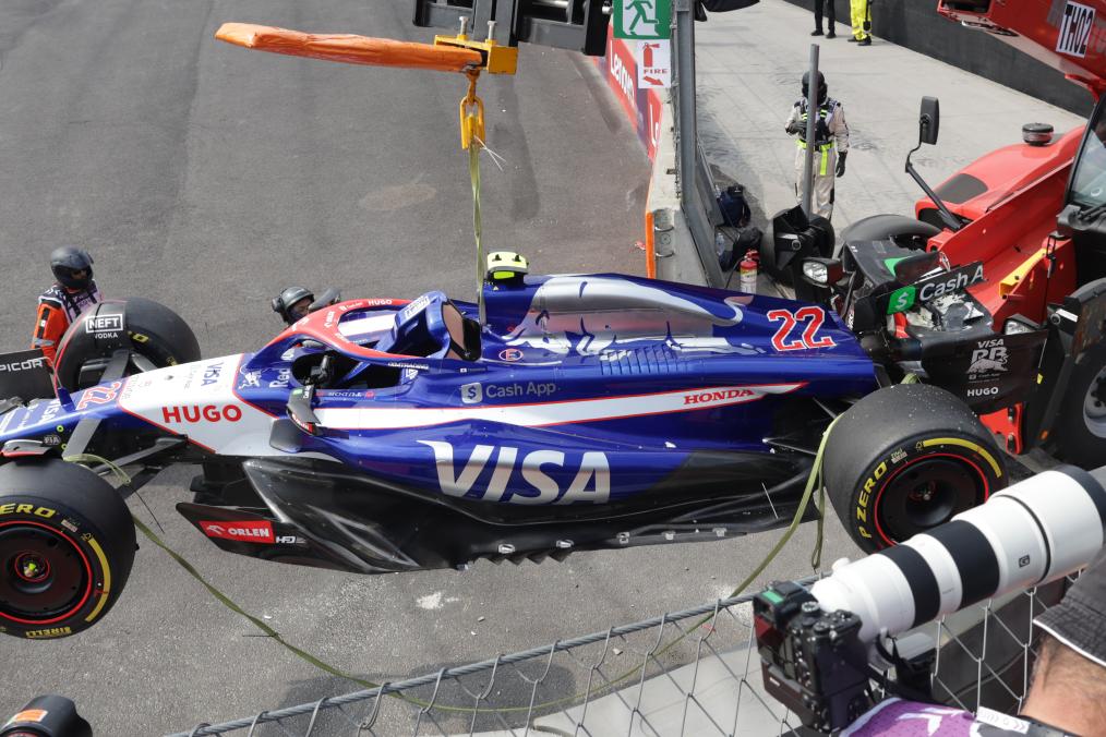 CIUDAD DE MEXICO, 28 octubre, 2024 (Xinhua) -- Imagen del 27 de octubre de 2024 del monoplaza del piloto japonés de la escudería RB, Yuki Tsunoda, siendo trasladado después de estrellarse durante la carrera del Gran Premio de México de Fórmula Uno en el Autódromo Hermanos Rodríguez, en la Ciudad de México, capital de México. (Xinhua/Francisco Cañedo)