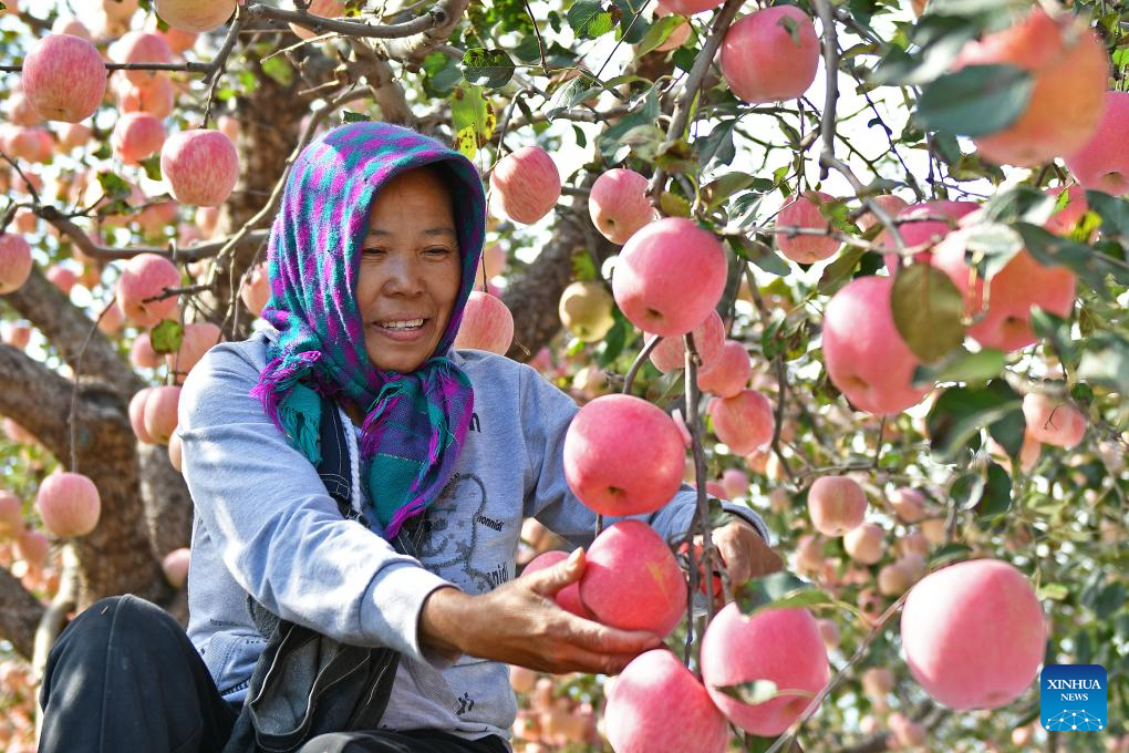 BEIJING, 28 octubre, 2024 (Xinhua) -- Una agricultora recoge manzanas en una granja, en el poblado de Gaotuan, en el distrito de Fushan de Yantai, en la provincia de Shandong, en el este de China, el 28 de octubre de 2024. En la actualidad, los agricultores de muchas zonas del país están aprovechando la temporada de cosecha de este año mientras se preparan para la siembra del próximo. (Xinhua/Sun Wentan)