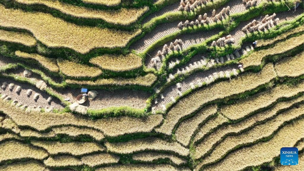 BEIJING, 28 octubre, 2024 (Xinhua) -- Vista aérea tomada con un dron el 27 de octubre de 2024 de agricultores cosechando arroz tardío, en la aldea de Wangli del poblado de Hehua, en la ciudad de Tengchong, en la provincia de Yunnan, en el suroeste de China. En la actualidad, los agricultores de muchas zonas del país están aprovechando la temporada de cosecha de este año mientras se preparan para la siembra del próximo. (Xinhua/Gong Zujin)