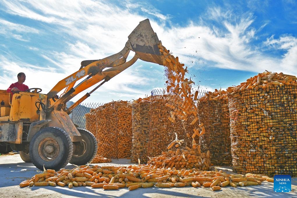 BEIJING, 28 octubre, 2024 (Xinhua) -- Un agricultor recoge maíz seco para almacenarlo, en la aldea de Gaotuan, en el distrito de Fushan de Yantai, en la provincia de Shandong, en el este de China, el 28 de octubre de 2024. En la actualidad, los agricultores de muchas zonas del país están aprovechando la temporada de cosecha de este año mientras se preparan para la siembra del próximo. (Xinhua/Sun Wentan)