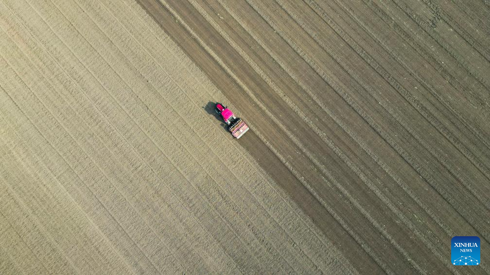 BEIJING, 28 octubre, 2024 (Xinhua) -- Vista aérea tomada el 28 de octubre de 2024 de un tractor sembrando trigo, en la aldea de Xiaozhang del distrito de Guangrao, en la provincia de Shandong, en el este de China. En la actualidad, los agricultores de muchas zonas del país están aprovechando la temporada de cosecha de este año mientras se preparan para la siembra del próximo. (Xinhua/Liu Yunjie)