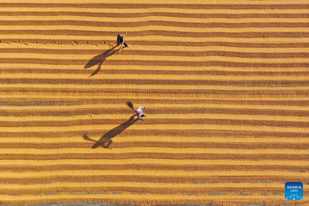 BEIJING, 28 octubre, 2024 (Xinhua) -- Vista aérea del 28 de octubre de 2024 de personas trabajando en un patio de secado de maíz en una granja familiar, en la aldea Xinlitun de la ciudad de Gaomi, en la provincia de Shandong, en el este de China. En la actualidad, los agricultores de muchas zonas del país están aprovechando la temporada de cosecha de este año mientras se preparan para la siembra del próximo. (Xinhua/Li Haitao)
