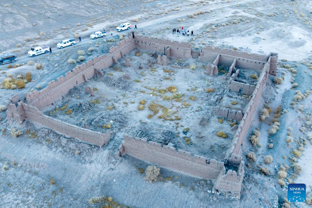 ATUX, 28 octubre, 2024 (Xinhua) -- Vista aérea tomada con un dron del 21 de octubre de 2024 de miembros de un equipo de expedición científica permaneciendo frente a las ruinas de una antigua barraca, en el municipio de Muji del distrito de Akto, en la prefectura autónoma kirguís de Kizilsu, en la región autónoma uygur de Xinjiang, en el noroeste de China. Una expedición científica multidisciplinaria de ocho días de duración fue lanzada el 19 de octubre en la ciudad de Atux, en Xinjiang. Durante la expedición, los científicos llevaron a cabo investigaciones en caminos antiguos, sitios históricos y marcas geográficas importantes en la prefectura autónoma kirguís de Kizilsu en Xinjiang. (Xinhua/Xu Xianhao)