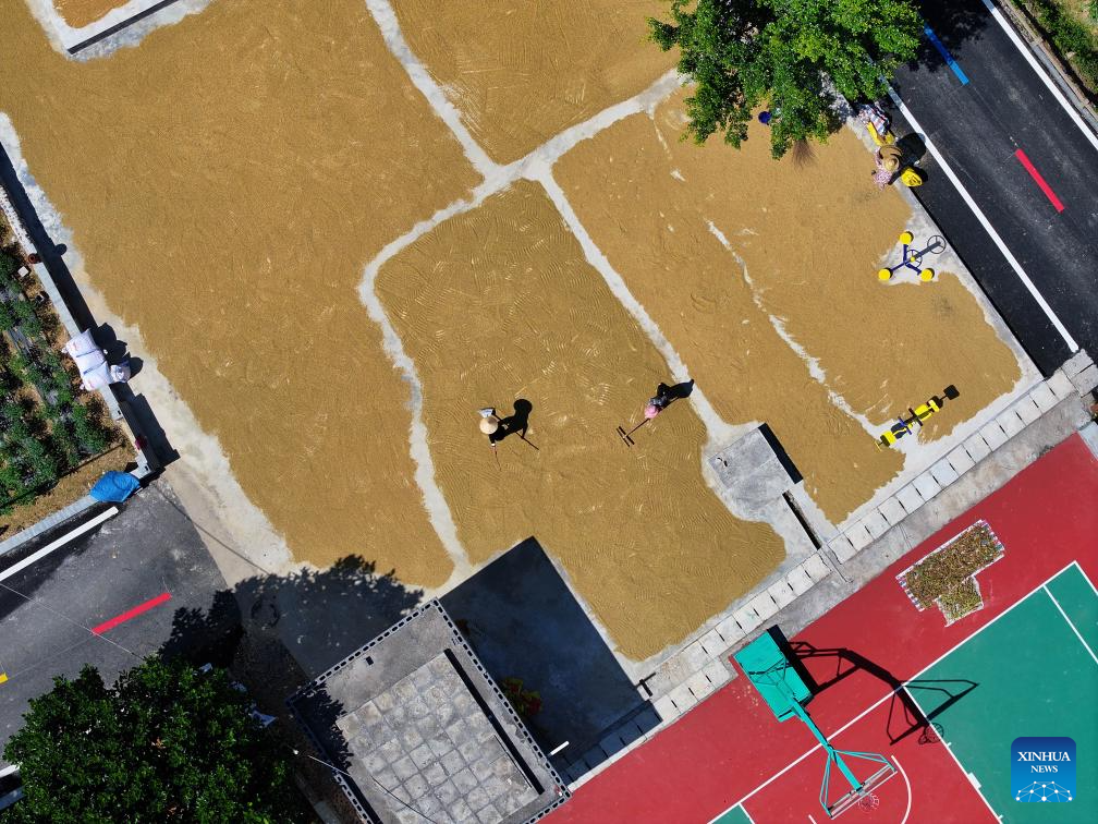 DEBAO, 29 octubre, 2024 (Xinhua) -- Imagen aérea tomada con un dron el 29 de octubre de 2024 de aldeanos aireando arroz, en la aldea de Nazao, en el distrito de Debao, en la región autónoma de la etnia zhuang de Guangxi, en el sur de China. (Xinhua/Huang Xiaobang)