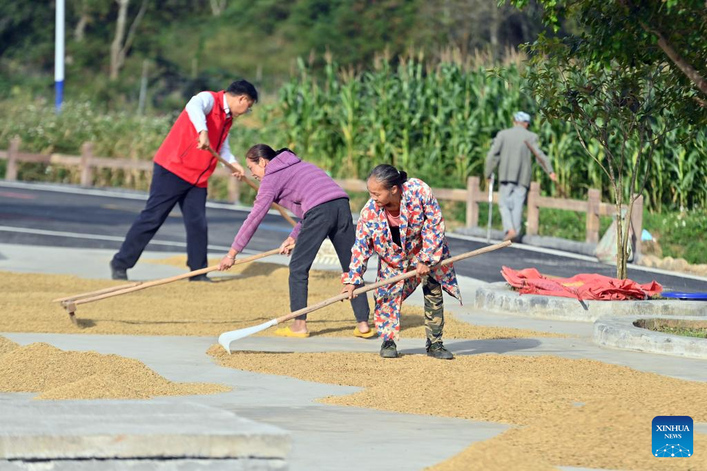 DEBAO, 29 octubre, 2024 (Xinhua) -- Aldeanos airean arroz, en la aldea de Nazao, en el distrito de Debao, en la región autónoma de la etnia zhuang de Guangxi, en el sur de China, el 29 de octubre de 2024. (Xinhua/Huang Xiaobang)