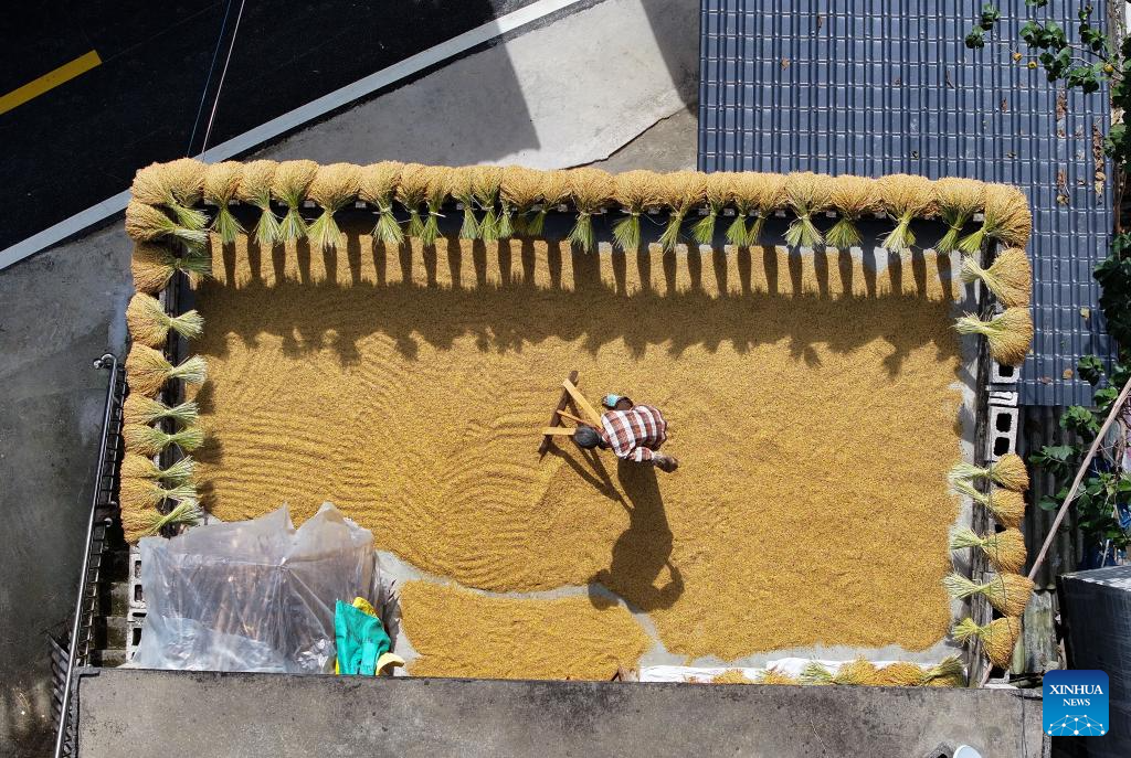 DEBAO, 29 octubre, 2024 (Xinhua) -- Imagen aérea tomada con un dron el 29 de octubre de 2024 de un aldeano aireando arroz, en la aldea de Nazao, en el distrito de Debao, en la región autónoma de la etnia zhuang de Guangxi, en el sur de China. (Xinhua/Huang Xiaobang)