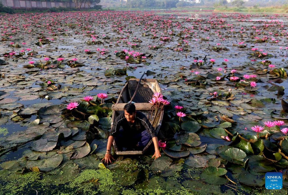 BHOPAL, 29 octubre, 2024 (Xinhua) -- Un hombre recoge lirios de acuáticos en flor en un estanque, en Bhopal, capital del estado de Madhya Pradesh, India, el 29 de octubre de 2024. (Xinhua/Str)