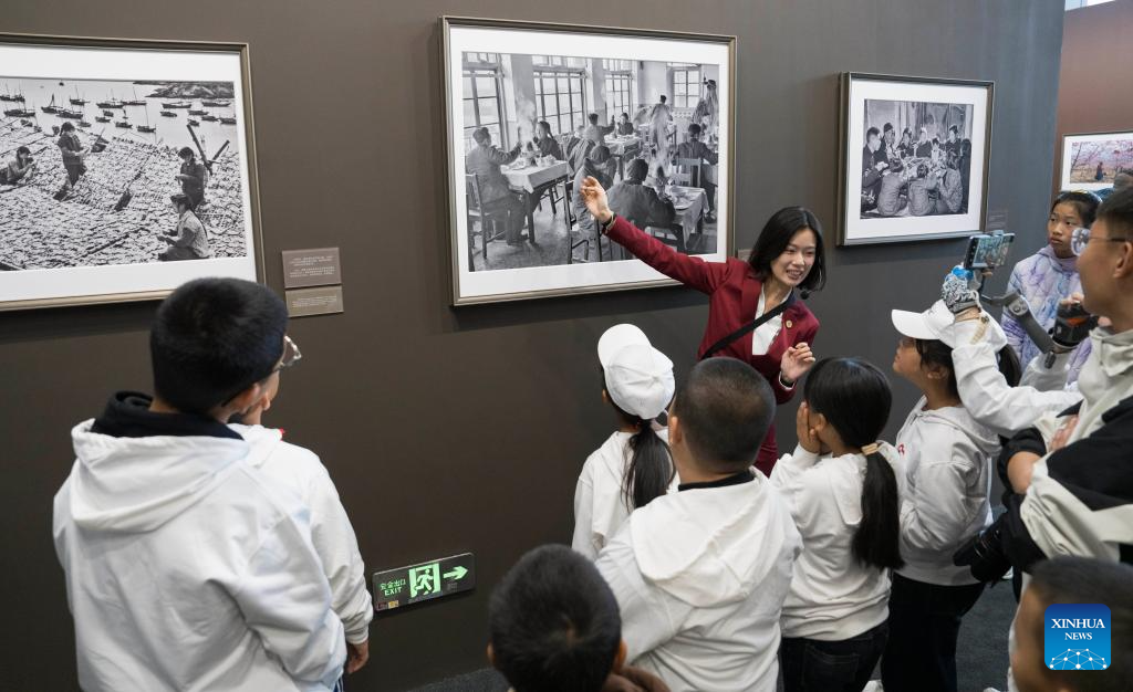 BEIJING, 30 octubre, 2024 (Xinhua) -- Una trabajadora presenta una fotografía a estudiantes y profesores en una exposición fotográfica celebrada en el Centro Nacional de Información Financiera, en Beijing, capital de China, el 30 de octubre de 2024. La exposición, organizada por la agencia nacional de noticias de China, Xinhua, documenta la transformación histórica del país en las últimas décadas. En la muestra se exhiben casi 500 fotografías que abarcan diversos períodos históricos, seleccionadas de la colección de Xinhua, el archivo fotográfico más grande del país, con más de 10 millones de imágenes. (Xinhua/Cai Yang)