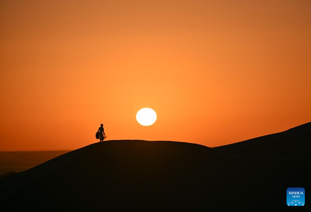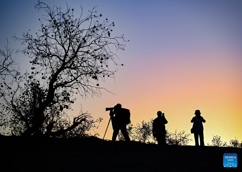 URUMQI, 28 octubre, 2024 (Xinhua) -- Imagen del 26 de octubre de 2024 de un turista observando el amanecer en el punto escénico de Huludao (Isla de la Calabaza), en el distrito de Yuli, en la región autónoma uygur de Xinjiang, en el noroeste de China. El singular paisaje otoñal del desierto, los lagos y el álamo del desierto (populus euphratica) atrae a muchos turistas. Hay decenas de millones de acres de álamos del desierto esparcidos por la cuenca del río Tarim, en Xinjiang. (Xinhua/Hu Huhu)