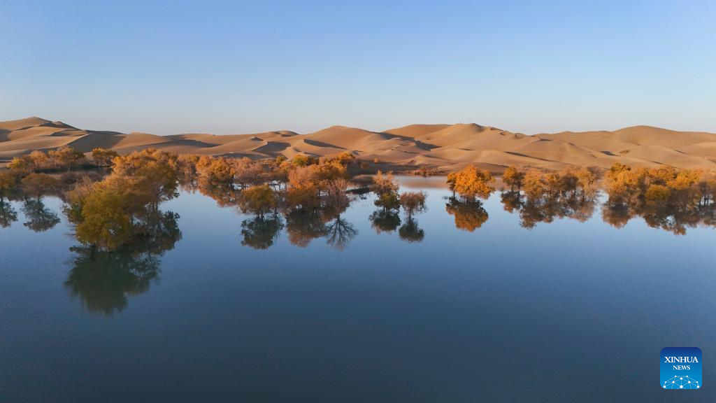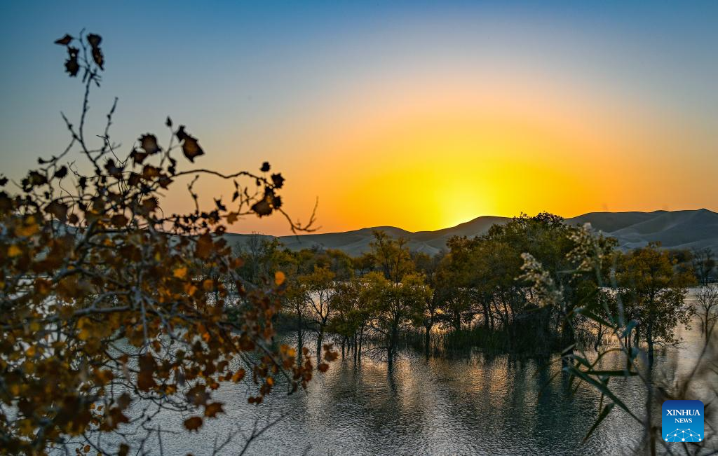 URUMQI, 28 octubre, 2024 (Xinhua) -- Imagen del 25 de octubre de 2024 del paisaje otoñal durante el atardecer en el punto escénico de Huludao (Isla de la Calabaza), en el distrito de Yuli, en la región autónoma uygur de Xinjiang, en el noroeste de China. El singular paisaje otoñal del desierto, los lagos y el álamo del desierto (populus euphratica) atrae a muchos turistas. Hay decenas de millones de acres de álamos del desierto esparcidos por la cuenca del río Tarim, en Xinjiang. (Xinhua/Chen Shuo)