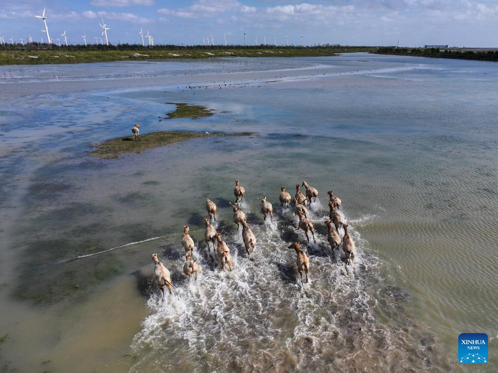 NANJING, 30 octubre, 2024 (Xinhua) -- Vista aérea tomada con un dron el 28 de octubre de 2024 de ciervos milú en la Reserva Natural Nacional del Milú de Dafeng, en la provincia de Jiangsu, en el este de China. Gracias a los esfuerzos intensificados en la protección ecológica y la preservación de los animales, la Reserva Natural Nacional del Milú de Dafeng ha dado la bienvenida a 825 ciervos milú recién nacidos, una especie endémica de China, en lo que va de año. La población de ciervos milú aquí ha superado los 8.200 ejemplares, incluidos unos 3.500 que viven solos en la naturaleza. (Xinhua/Lyu Shuai)