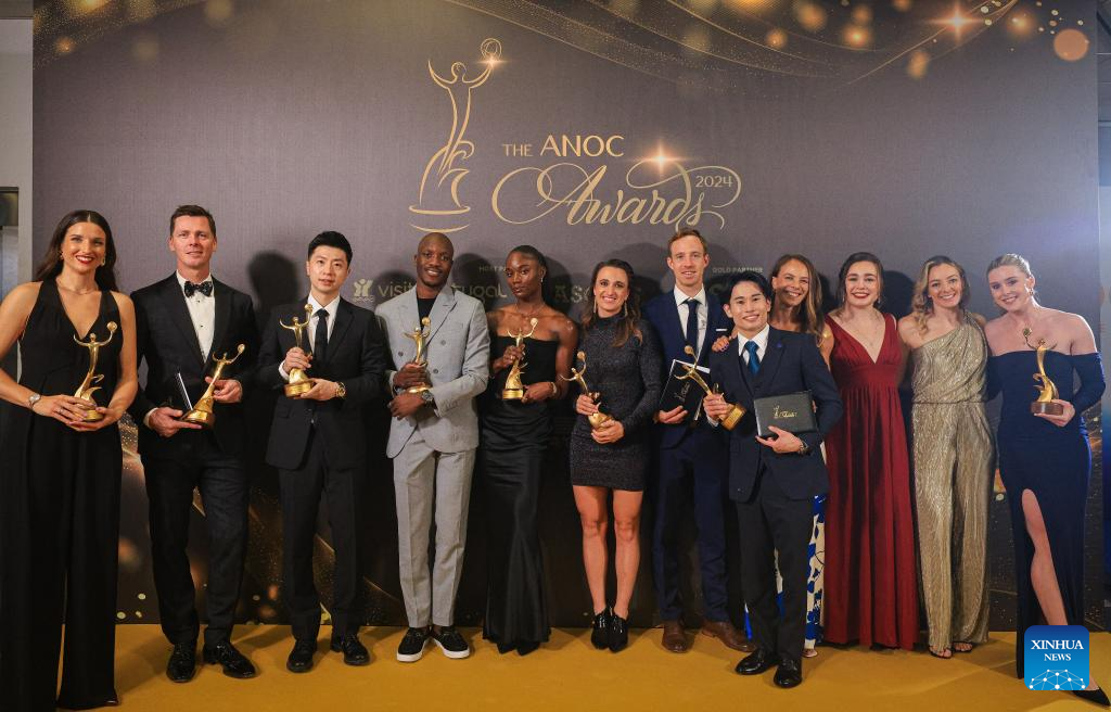 CASCAIS, 31 octubre, 2024 (Xinhua) -- Imagen del 30 de octubre de 2024 de los ganadores de los premios ANOC posando para una fotografía grupal durante la ceremonia de entrega de premios de la Asociación de Comités Olímpicos Nacionales (ANOC, por sus siglas en inglés) 2024, en Cascais, Portugal. (Xinhua/Meng Dingbo)